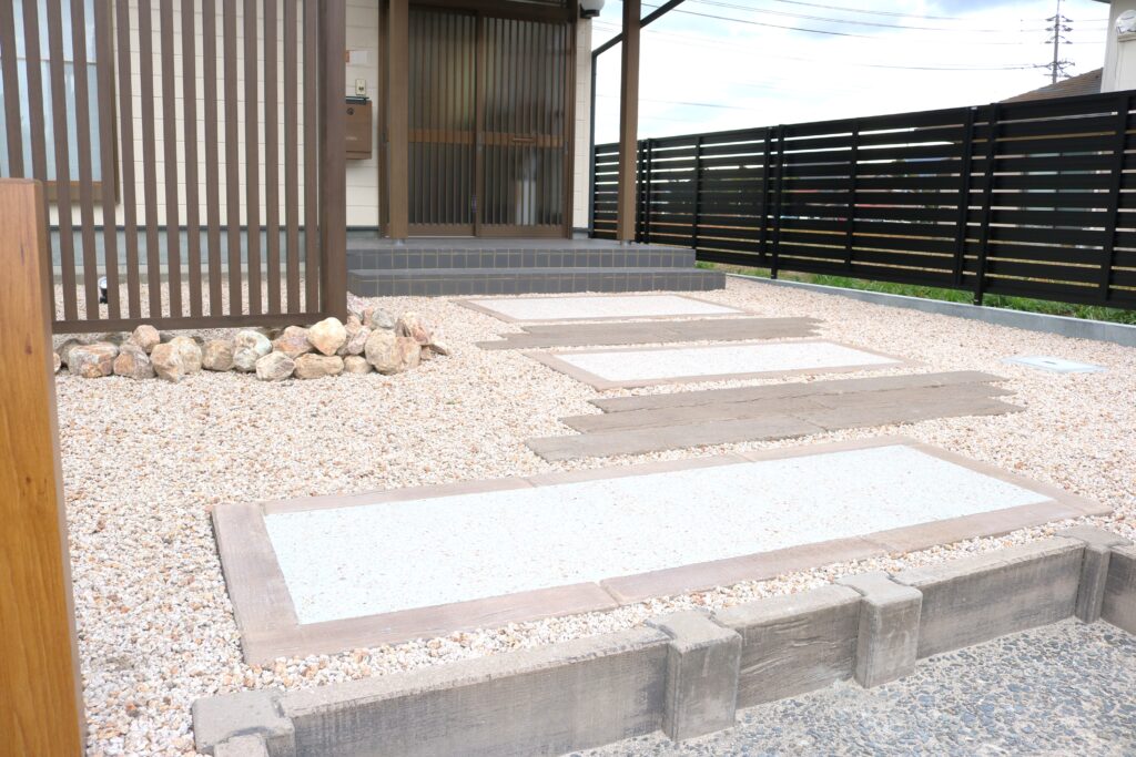 白い部分は洗い出しになっていて、周りに敷いてある砂利と同じ砂利を種石に使い、4方を枕木コンクリートで囲むことで雰囲気を統一しています。