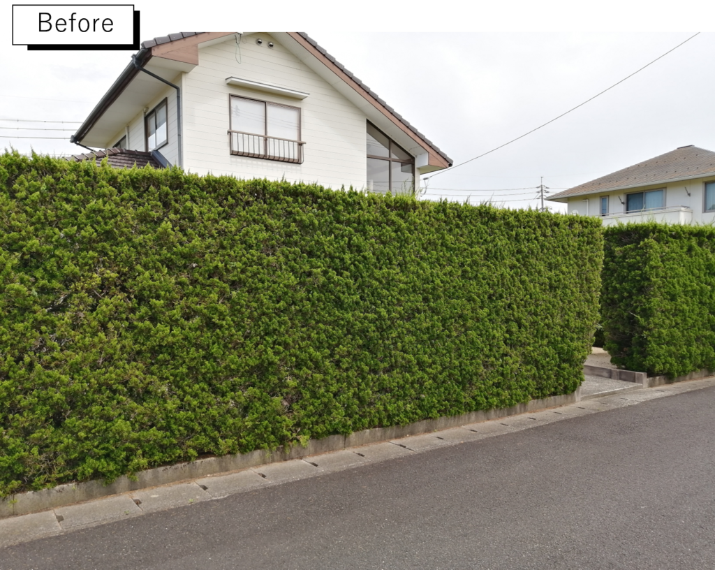 お家を買われた時から植えてあった生け垣は、いつも自分で剪定をしておられるとのこと。風よけにもなってよかったのですが、とにかく車を2台停めるためのスペースを作らなくてはなりませんので、撤去することにして今後は手のかからない植物以外で境界を仕切ることになりました。