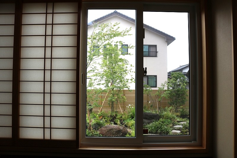 窓枠が絵画の額縁の様な役割をしてとても素敵な景色になりました。背景の竹垣がぐっと庭の印象をまとめてくれています。