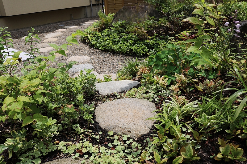 立体的な庭にして、飛び石の通路を設けることで、お庭を探索できるようにしました。植物の中をずんずん進んでいくなんてワクワク感が高まりますよね。四季に合わせて色々な花が咲くのでそれを愛でに行くのも楽しみの一つです。