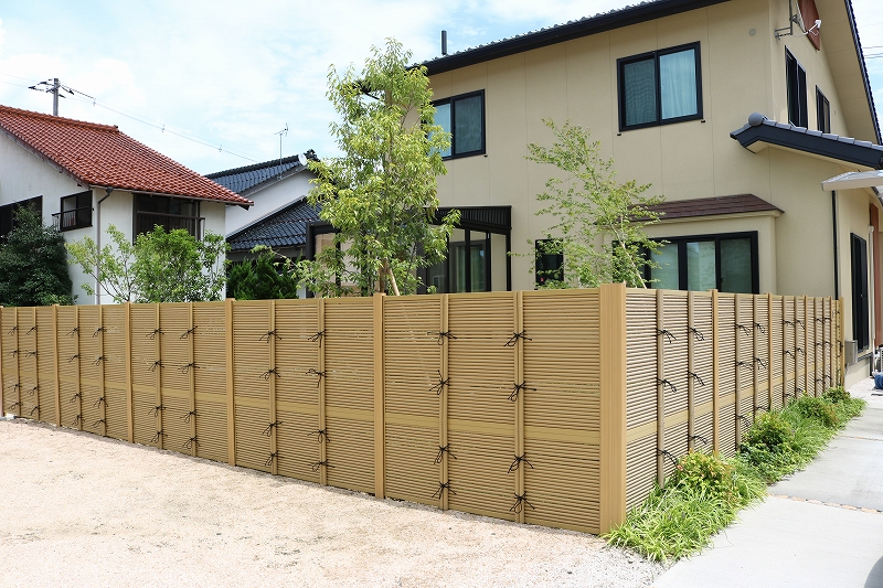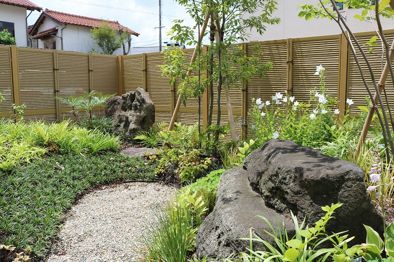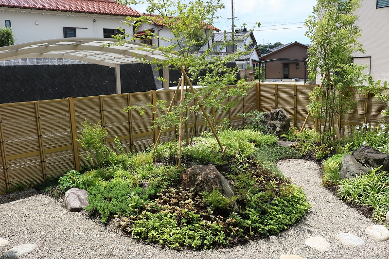 人工竹垣のフェンスをして庭を囲い、プライベート空間で癒やしの庭を楽しめるようにしました。圧迫感のない自然な雰囲気でモダンな里山と和風のMIXしたお庭ができました。
