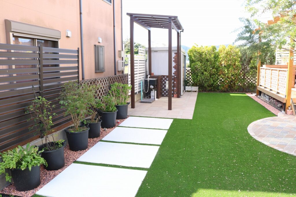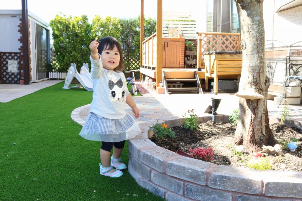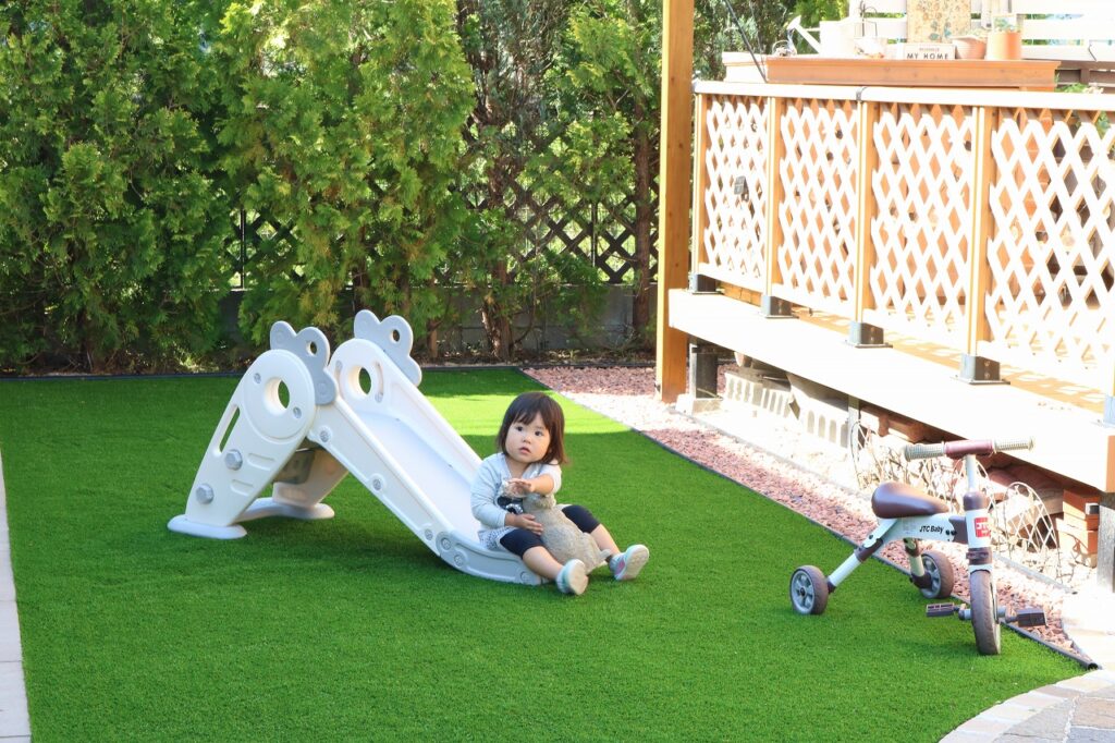 周囲には人工芝を敷き、雑草対策をしながら、お子さまが安心して遊べるやわらかな空間にしました。