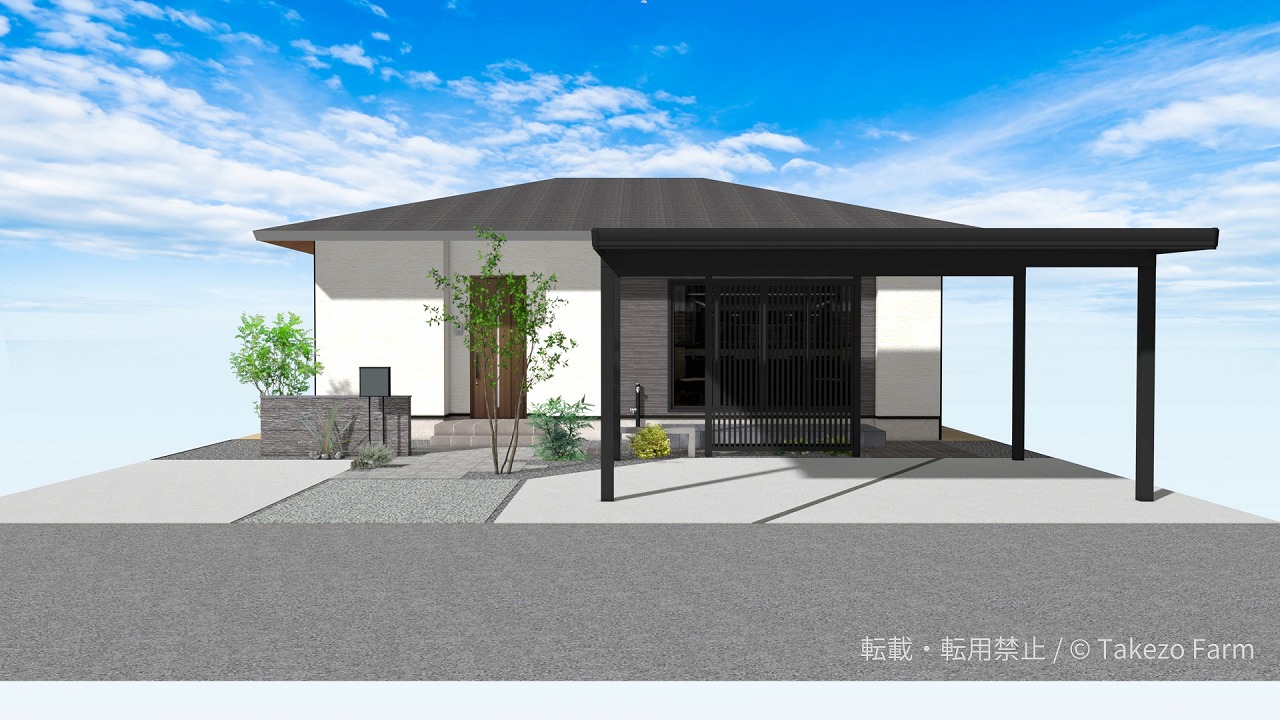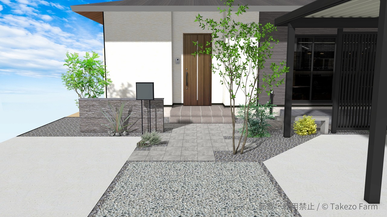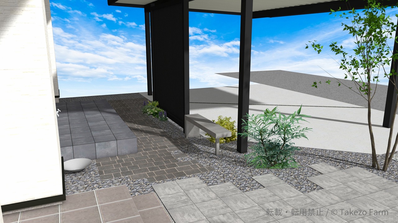 門まわりやアプローチ、駐車スペースは、できるだけ要素を整理し、ラインをすっきりと見せることで、建物との一体感が生まれます。黒やグレーを基調に、白をアクセントとして加えることで、重厚感がありながらも重くなりすぎない、品のある印象に仕上がります。