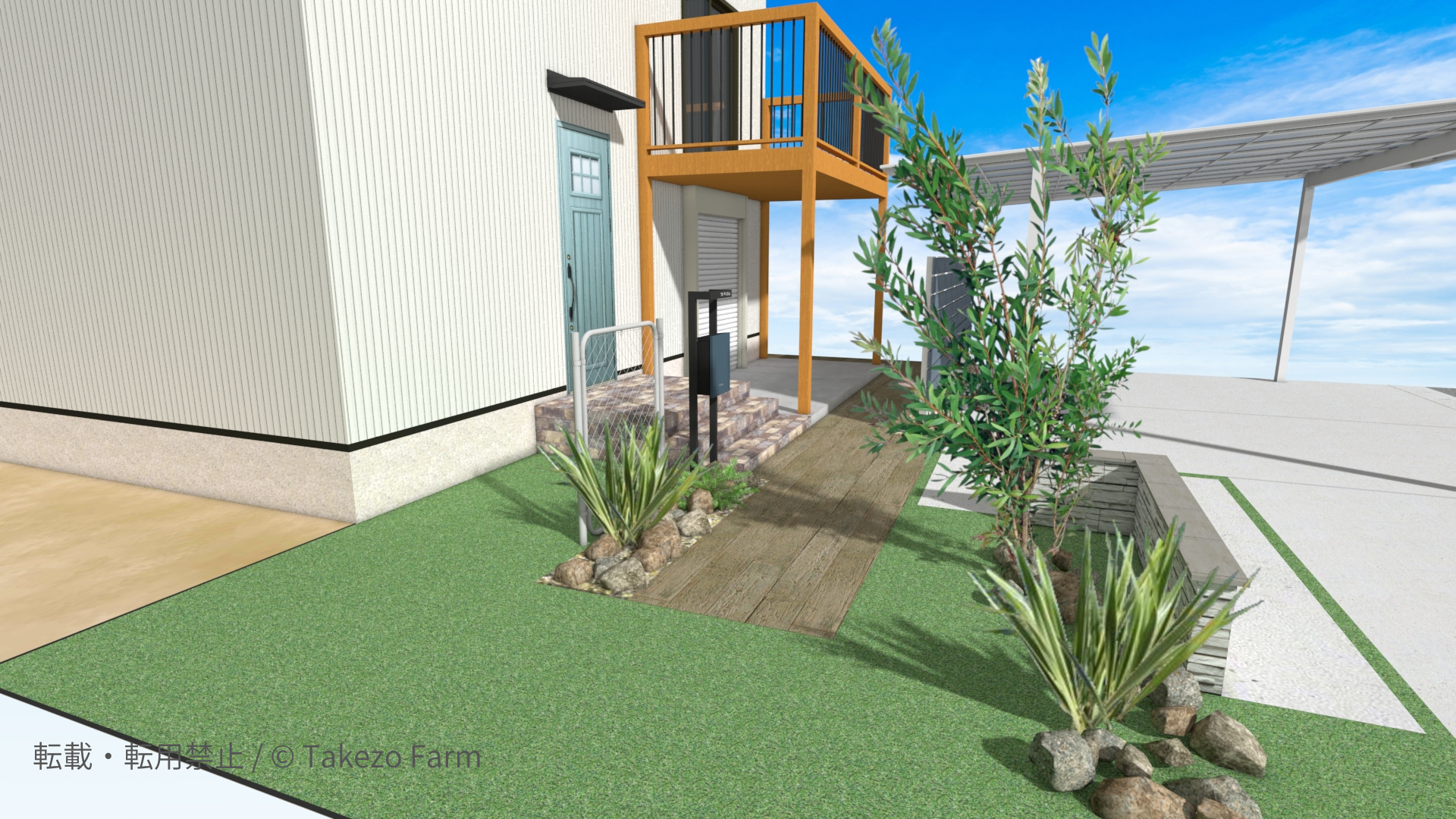 デザインの特徴枕木、ゴロタ石、アガベ等のドライ植物、ガルバリウム