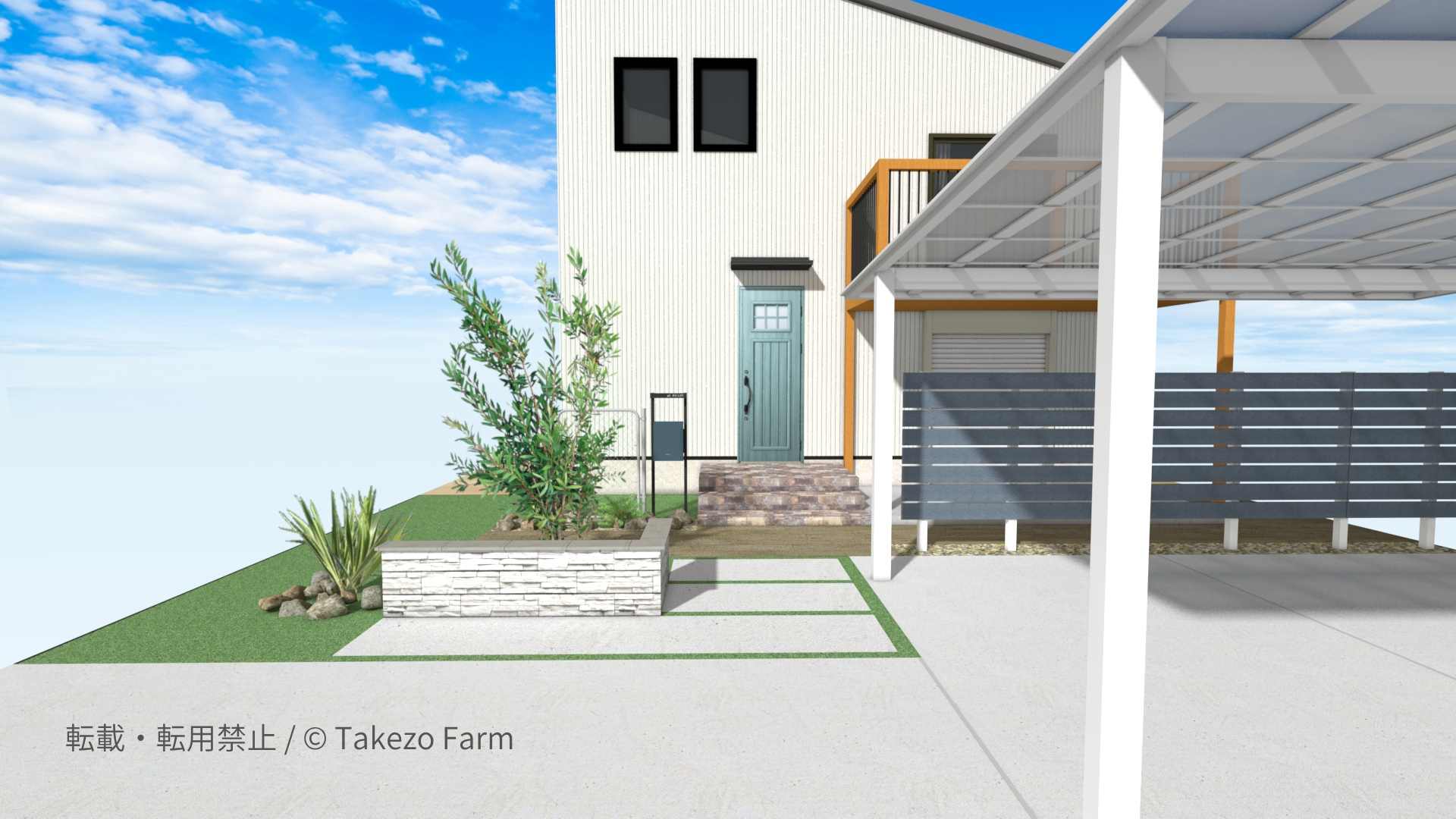 開放感のある駐車スペース、軽やかなフェンス、植栽の動きや素材の表情などが重なり合うことで、住まいにのびやかな個性を与えてくれます。