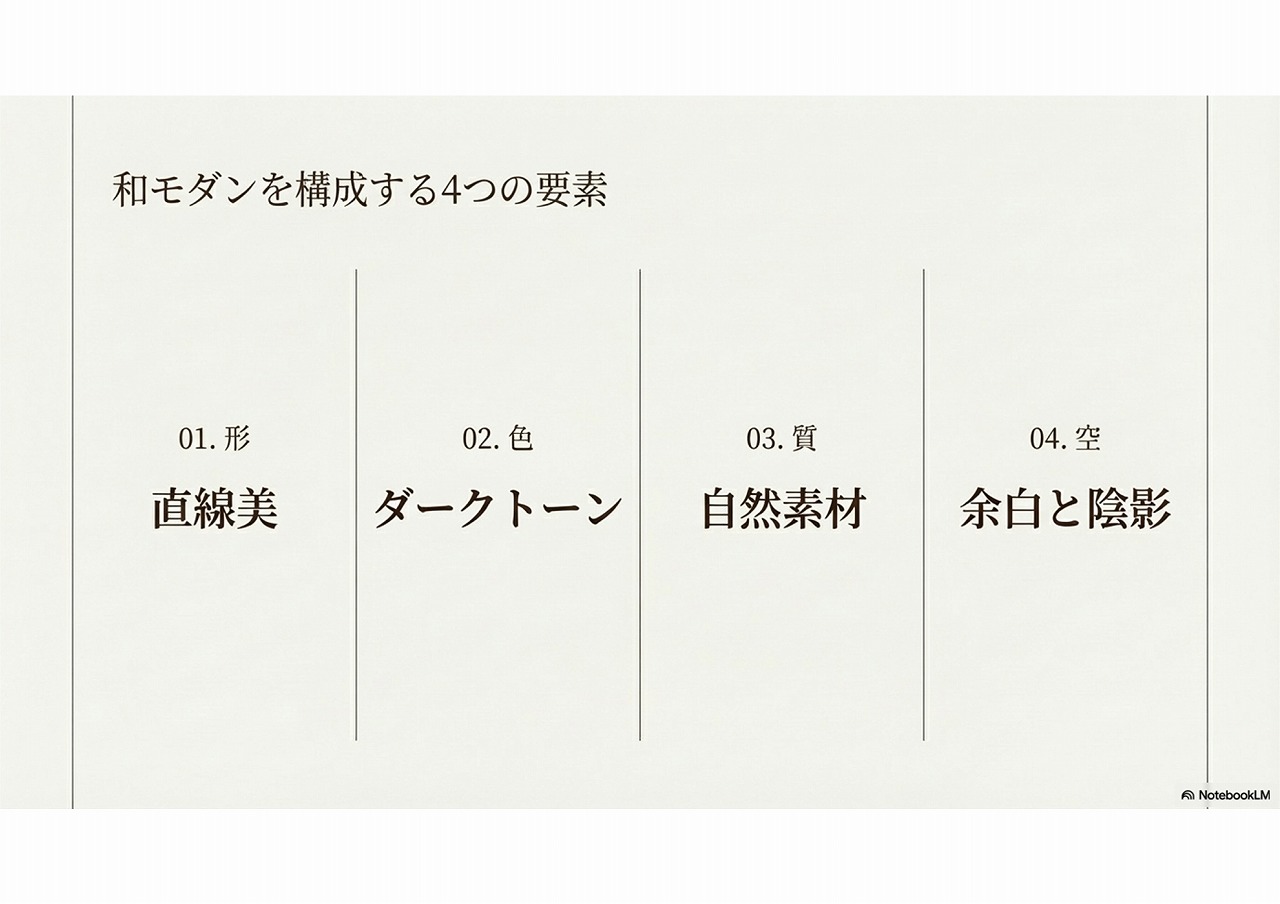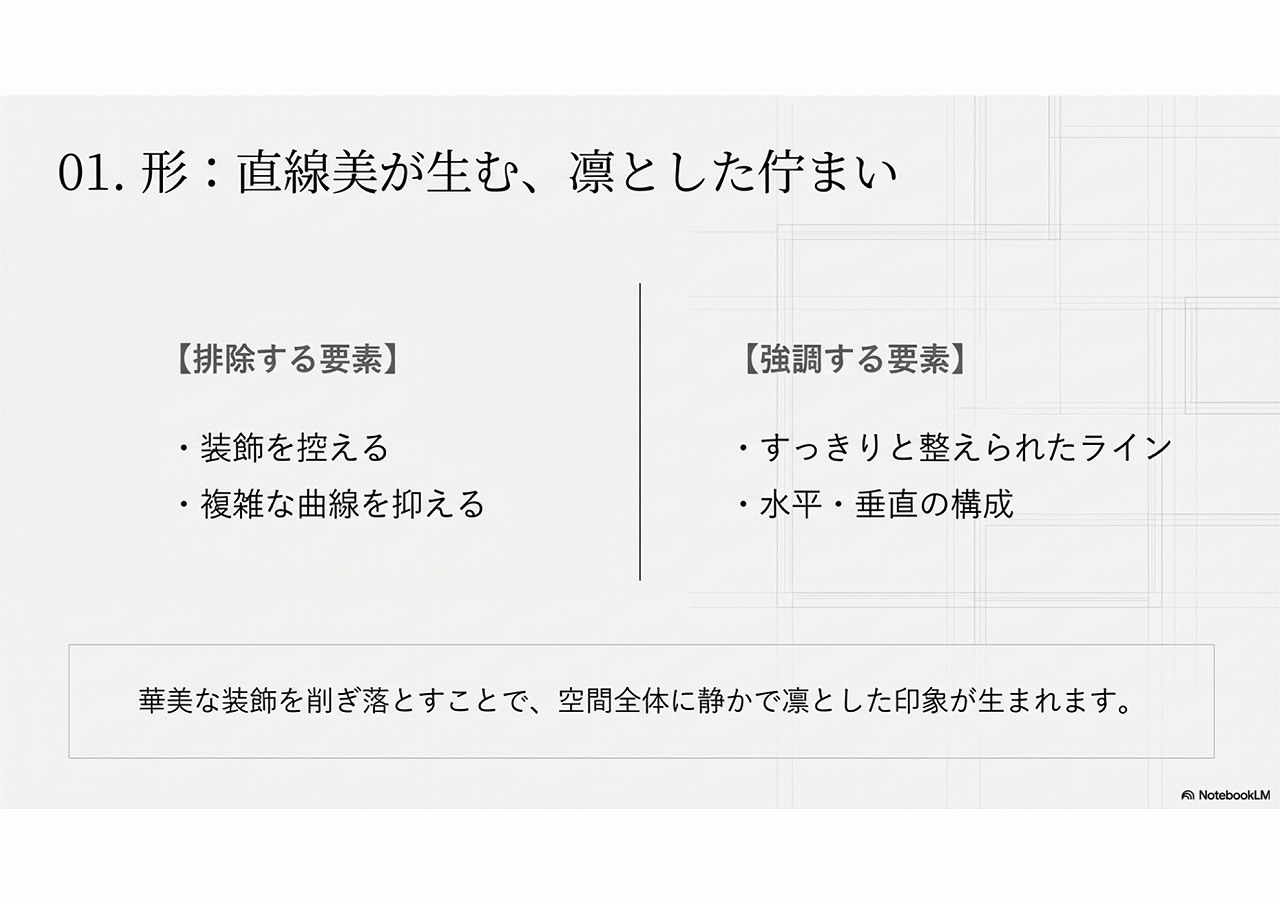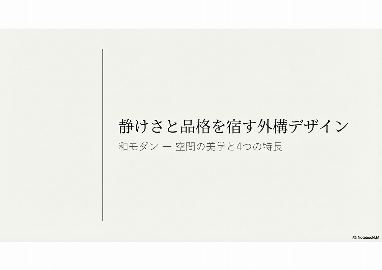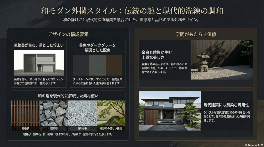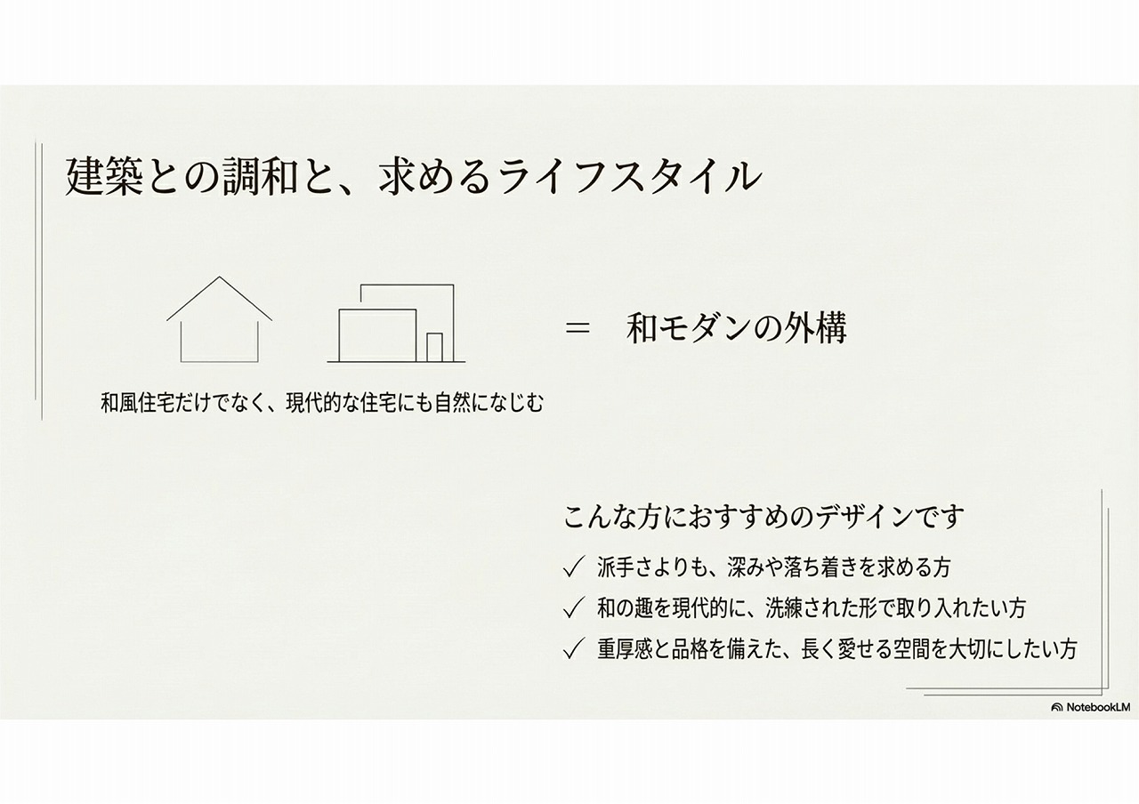| 特徴(雰囲気) | 伝統的な和の品格や静寂を、直線美とダークトーンで表現した重厚なスタイル |