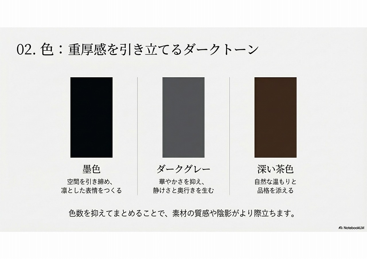 色合いは、墨色、ダークグレー、深い茶色などの落ち着いたダークトーンを基調とするのが特徴です。
