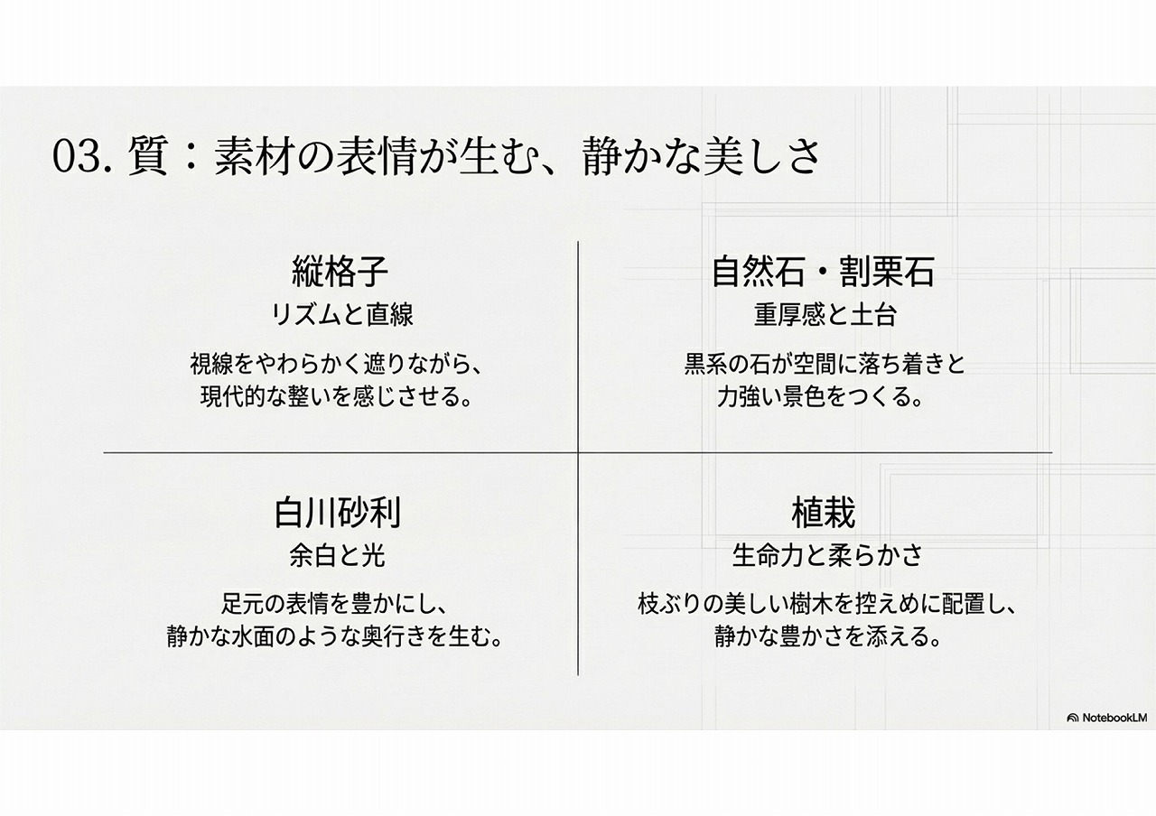 また、植栽も重要な要素であり、枝ぶりの美しい樹木や足元の低木を控えめに配置することで、空間に静かな豊かさを添えることができます。