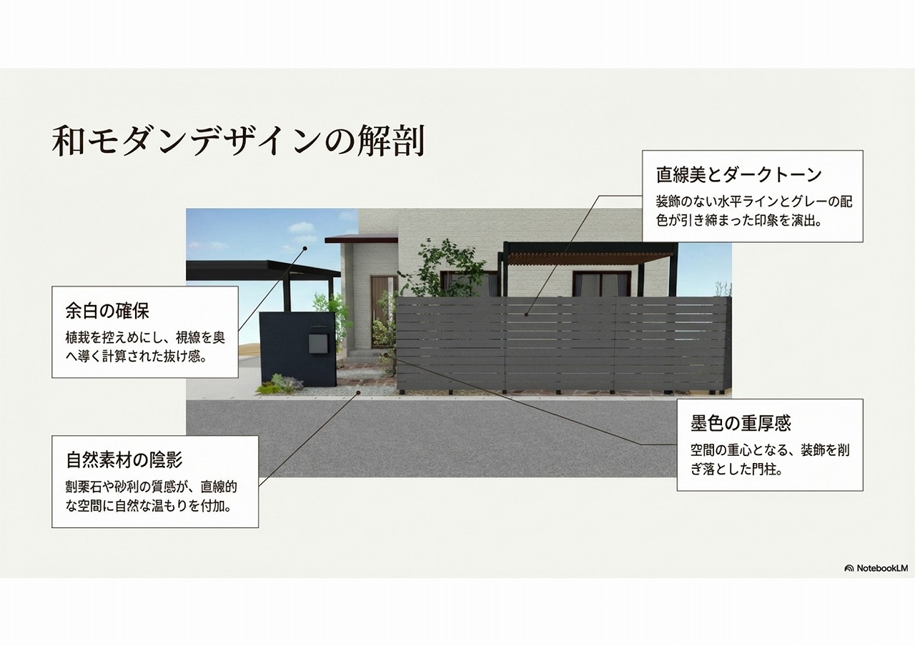 和モダンは、伝統的な和の趣や静けさを大切にしながら、現代的な直線美と洗練された構成で表現した外構スタイルです。