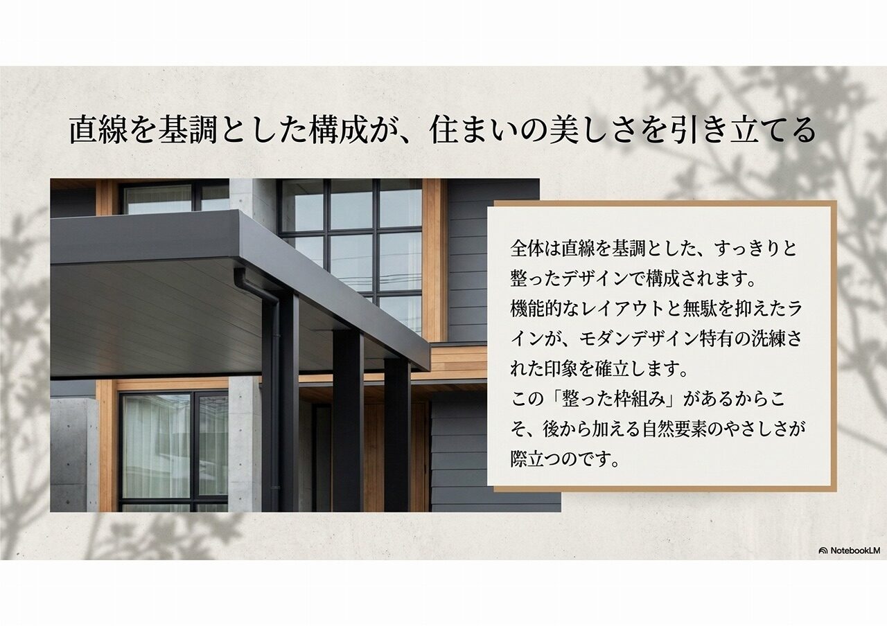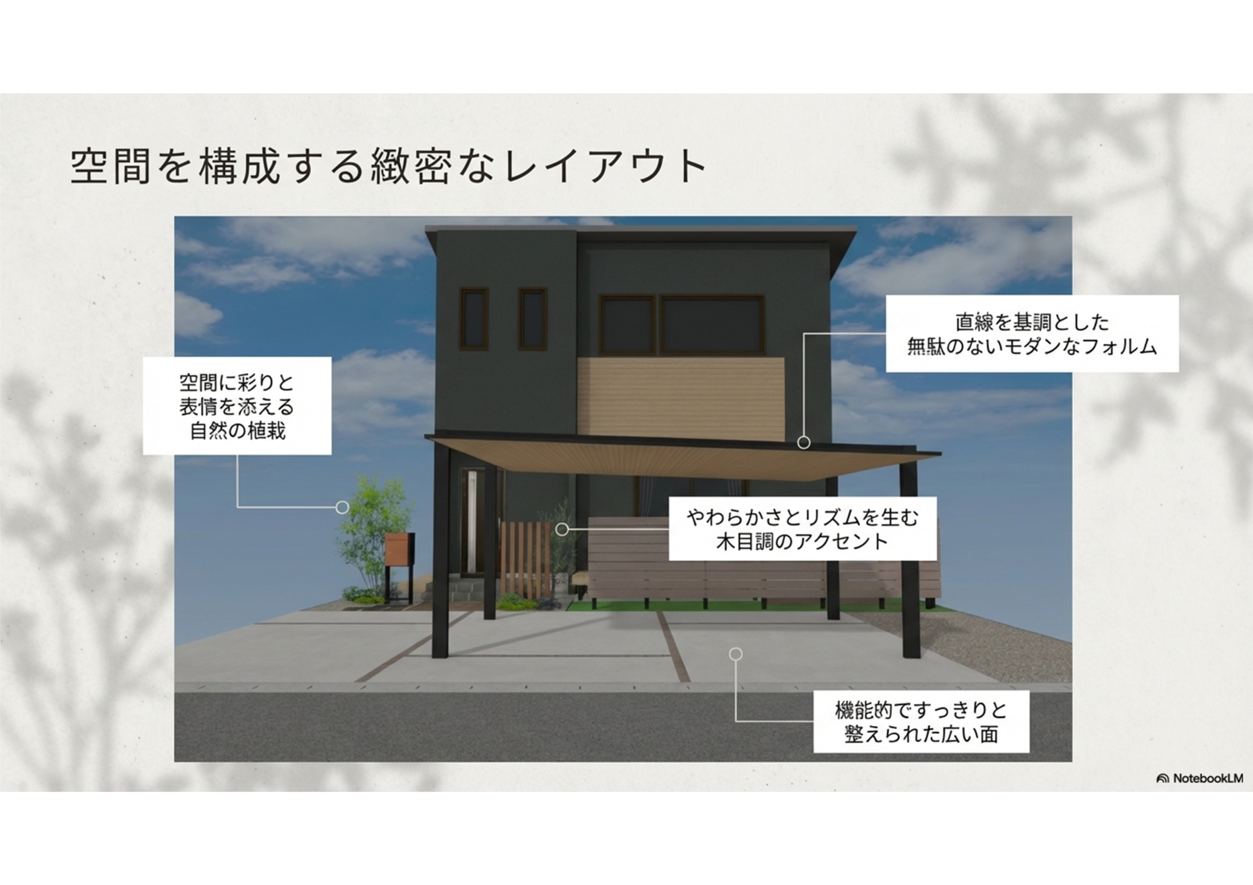 | デザインの特徴 | コンクリート、木目調アルミ材、植栽、自然石 |