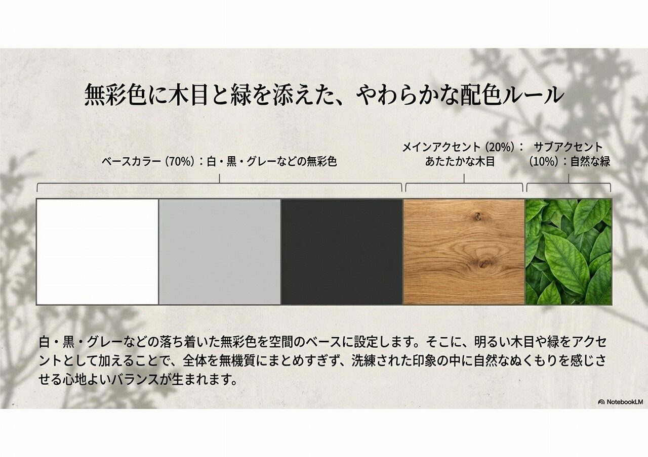 | 色合い | 無彩色(白・黒・グレー)+ 明るい木目・緑 |