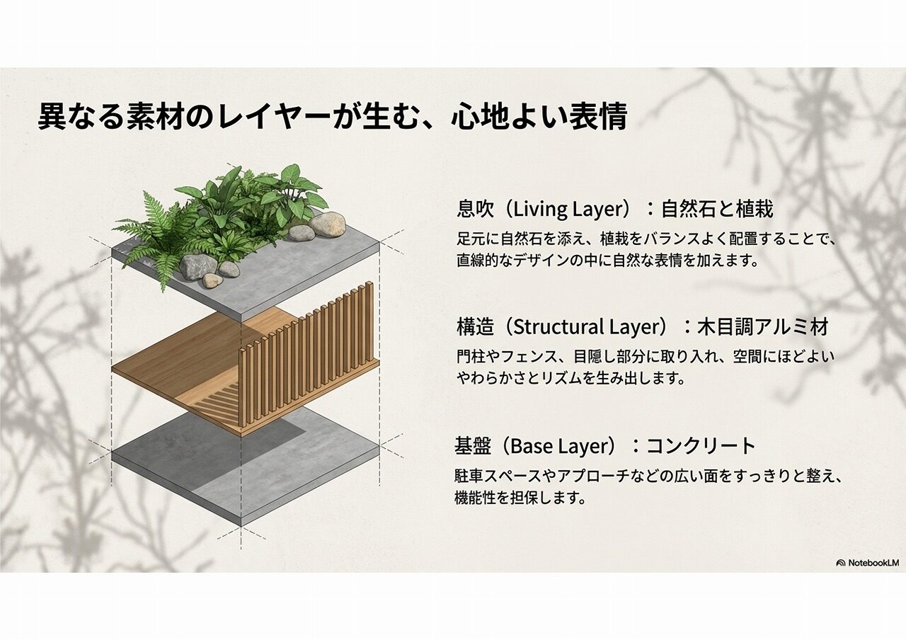 素材には、コンクリート、木目調アルミ材、植栽、自然石などがよく用いられます。