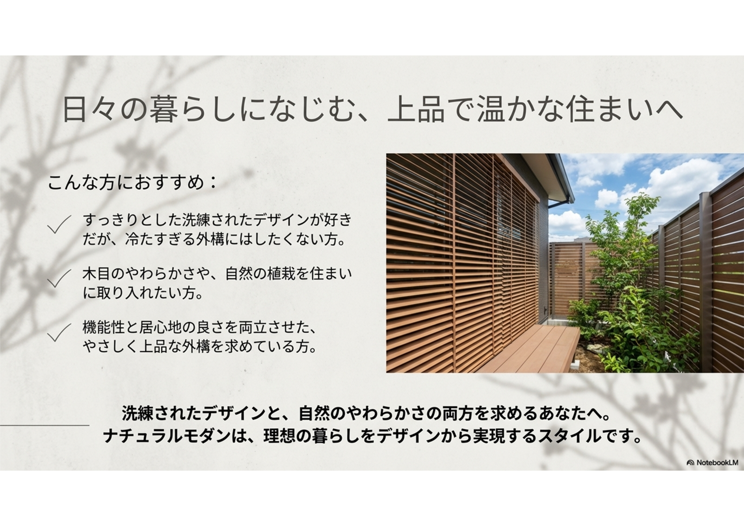 すっきりとしたデザインが好きでありながら、冷たすぎない外構にしたい方、自然素材や植栽を取り入れて、住まいに温もりを加えたい方に適したスタイルです。