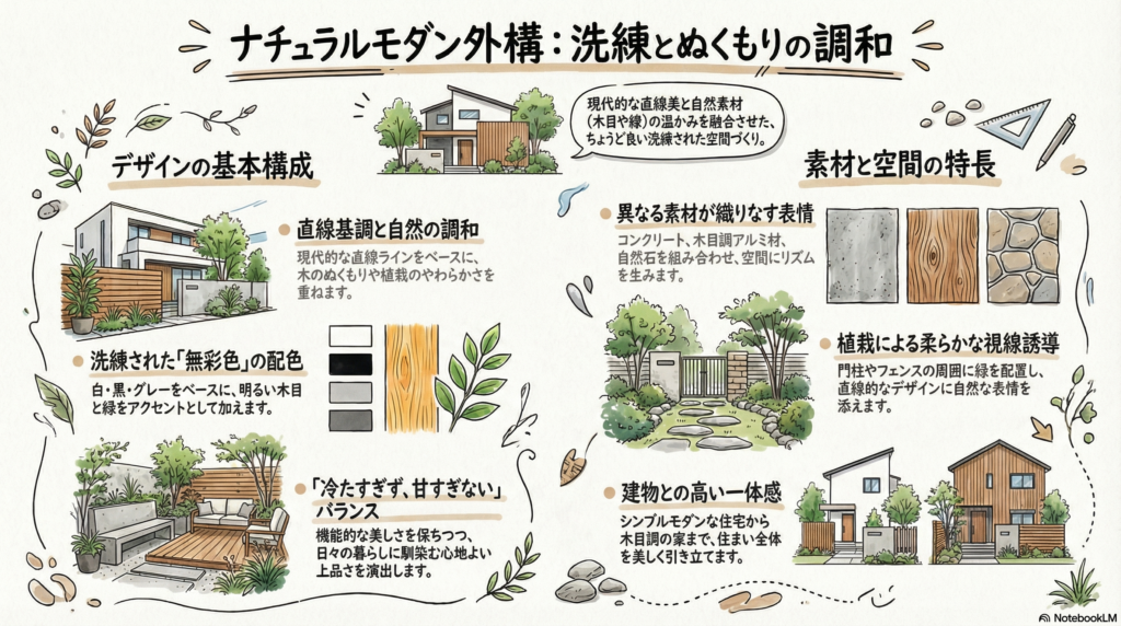 ナチュラルモダンは、現代的な直線を基調としたすっきりとした構成に、木のぬくもりや植栽のやわらかさを調和させた外構スタイルです。