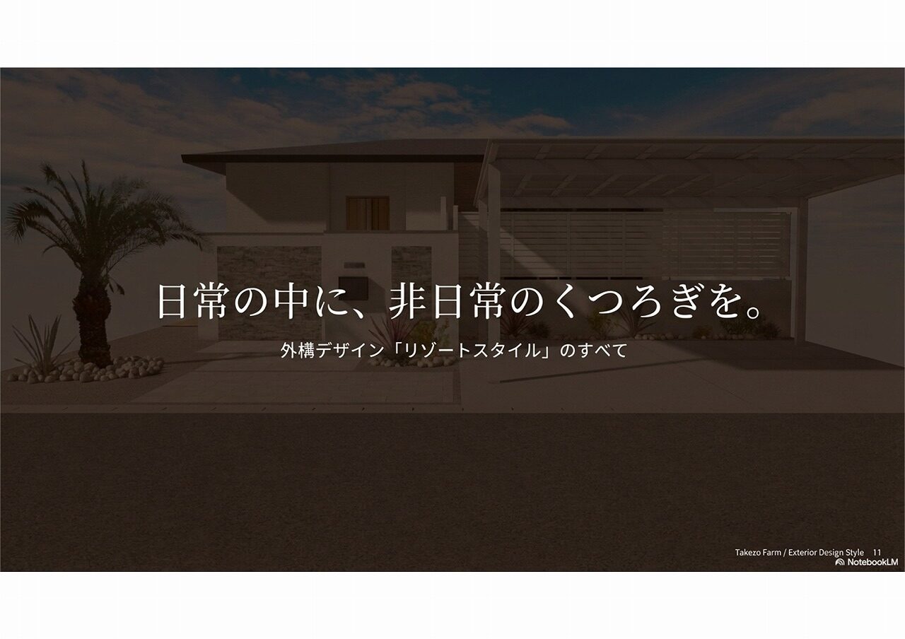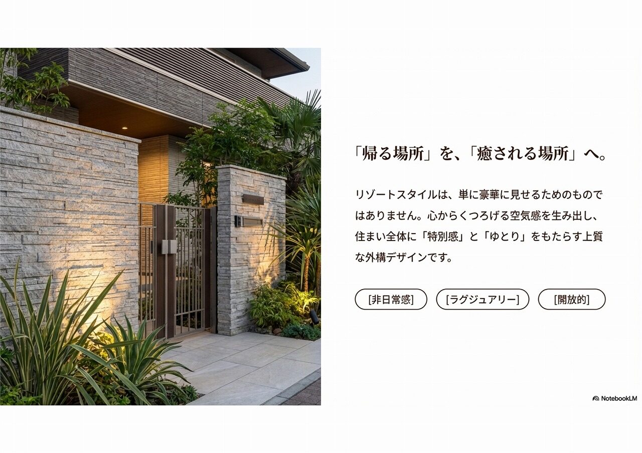 リゾートスタイルは、暮らしの中に癒しと高級感を取り入れたい方に適した外構デザインです。