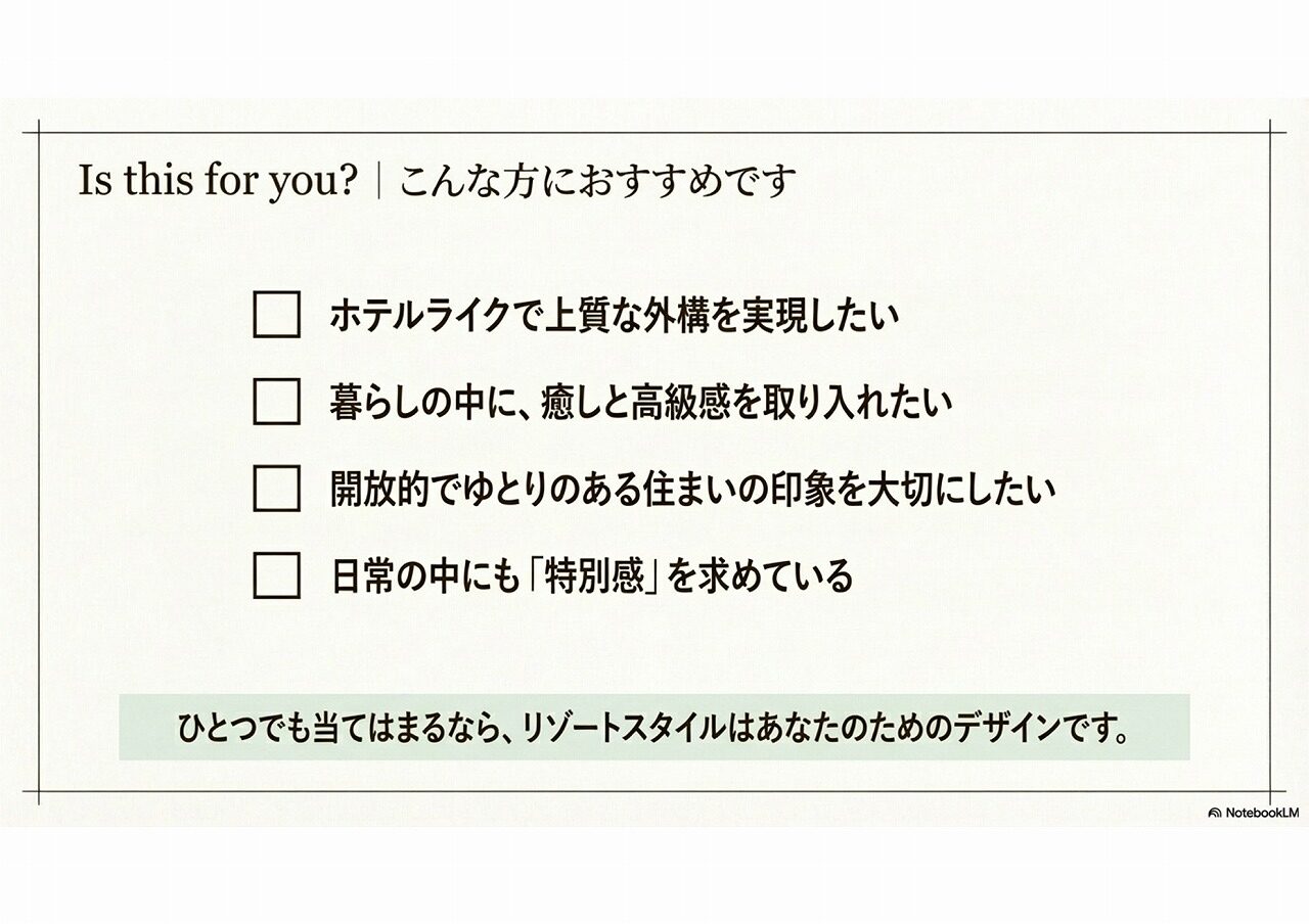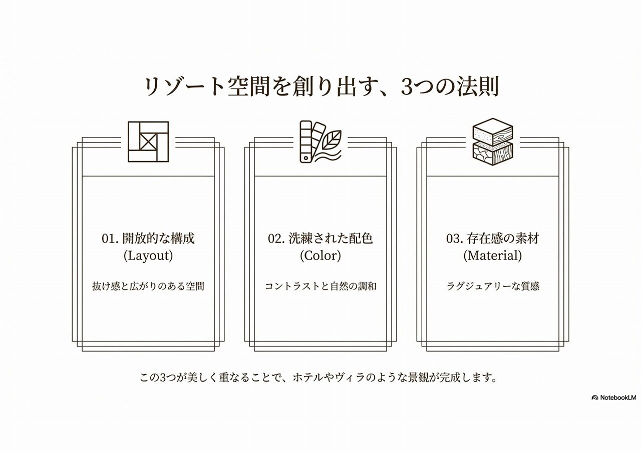 リゾートスタイルの魅力は、単に豪華に見せるだけではなく、心からくつろげる空気感を生み出せることにあります。