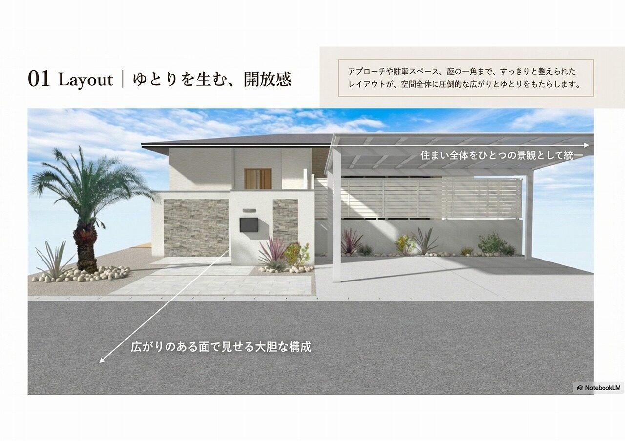 日常の中にも特別感を求める方、開放的でゆとりのある住まいの印象を大切にしたい方、ホテルライクで上質な外構を実現したい方におすすめです。