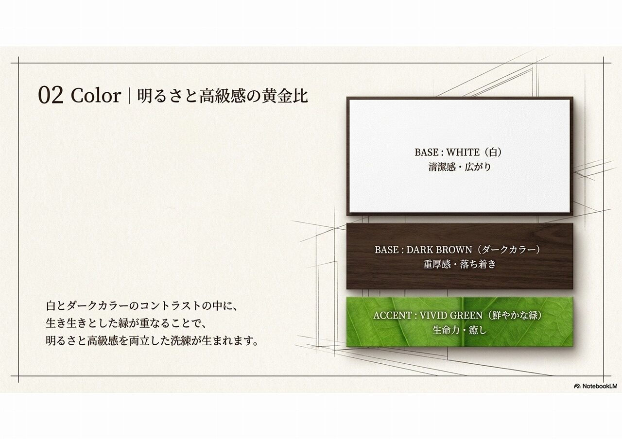 色合いは、ダークブラウンやホワイトを基調に、鮮やかなグリーンをアクセントとして取り入れるのが特徴です。