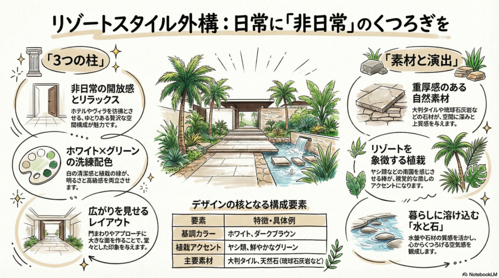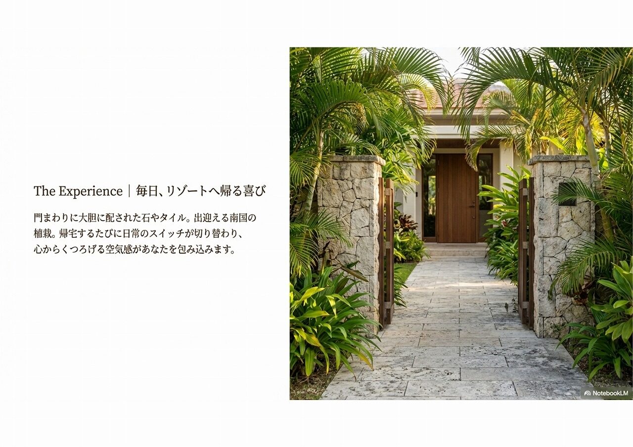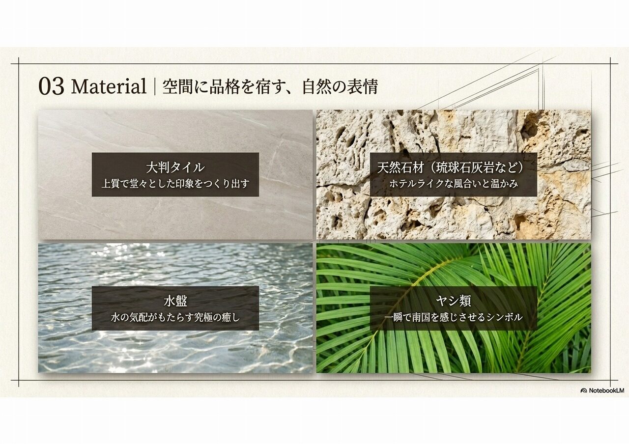 | デザインの特徴 | 大判タイル、天然石材(琉球石灰岩など)、水盤、ヤシ類 |