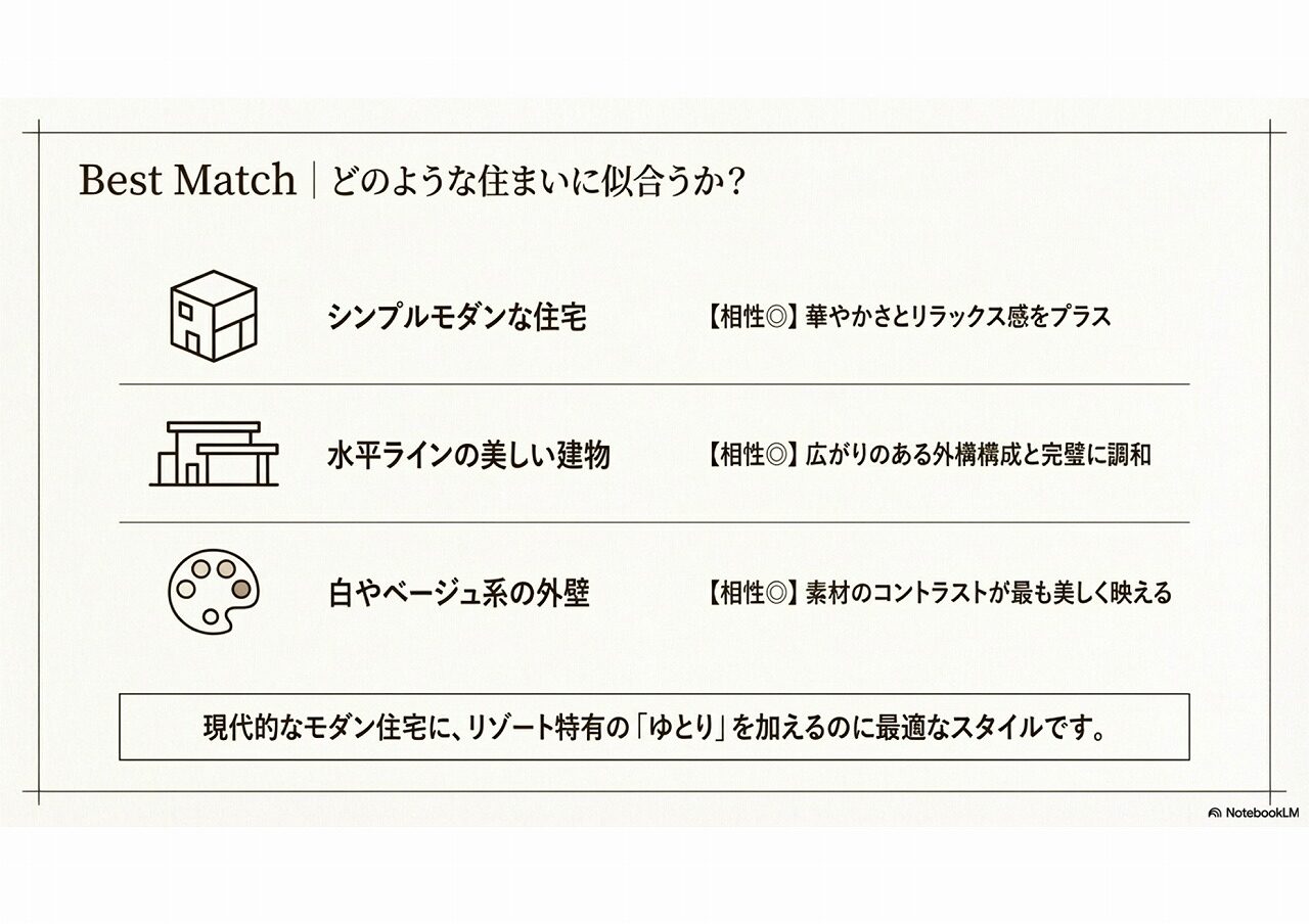 また、リゾートスタイルは、シンプルモダンな住宅や水平ラインの美しい建物、白やベージュ系の外壁を持つ住まいとの相性が良く、モダン住宅に華やかさやリラックス感を加えたい場合にも適しています。