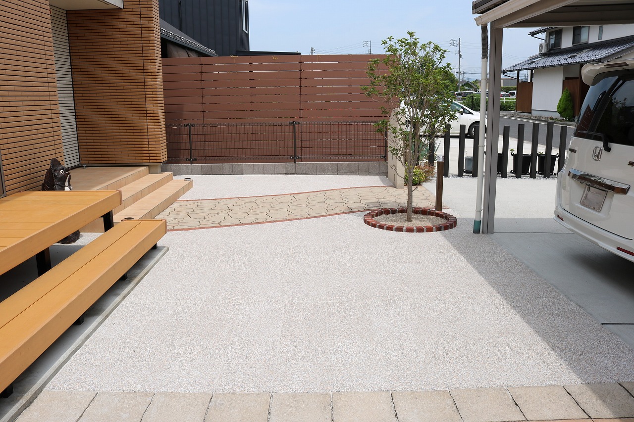 まず、砂利が散らばってしまう部分には、インターロッキング舗装をご提案。